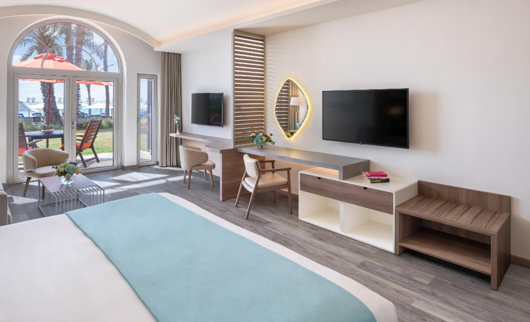Отель JA Palm Tree Court на берегу моря предлагает исключительно люксы, гарантируя гостям исключительный комфорт и ощущение полного уединения. 212 просторных люксов и апартаментов, окруженных пышными тропическими садами и извилистыми дорожками, расположены рядом с 800‑метровым частным пляжем отеля. Здесь вас ждут купание на лошадях и катание на пони для детей, восстанавливающие ритуалы в спа-центре Calm Spa и другие развлечения. Это одно из лучших мест в Дубае для романтического и семейного отдыха вдали от мира на безмятежном берегу моря.
